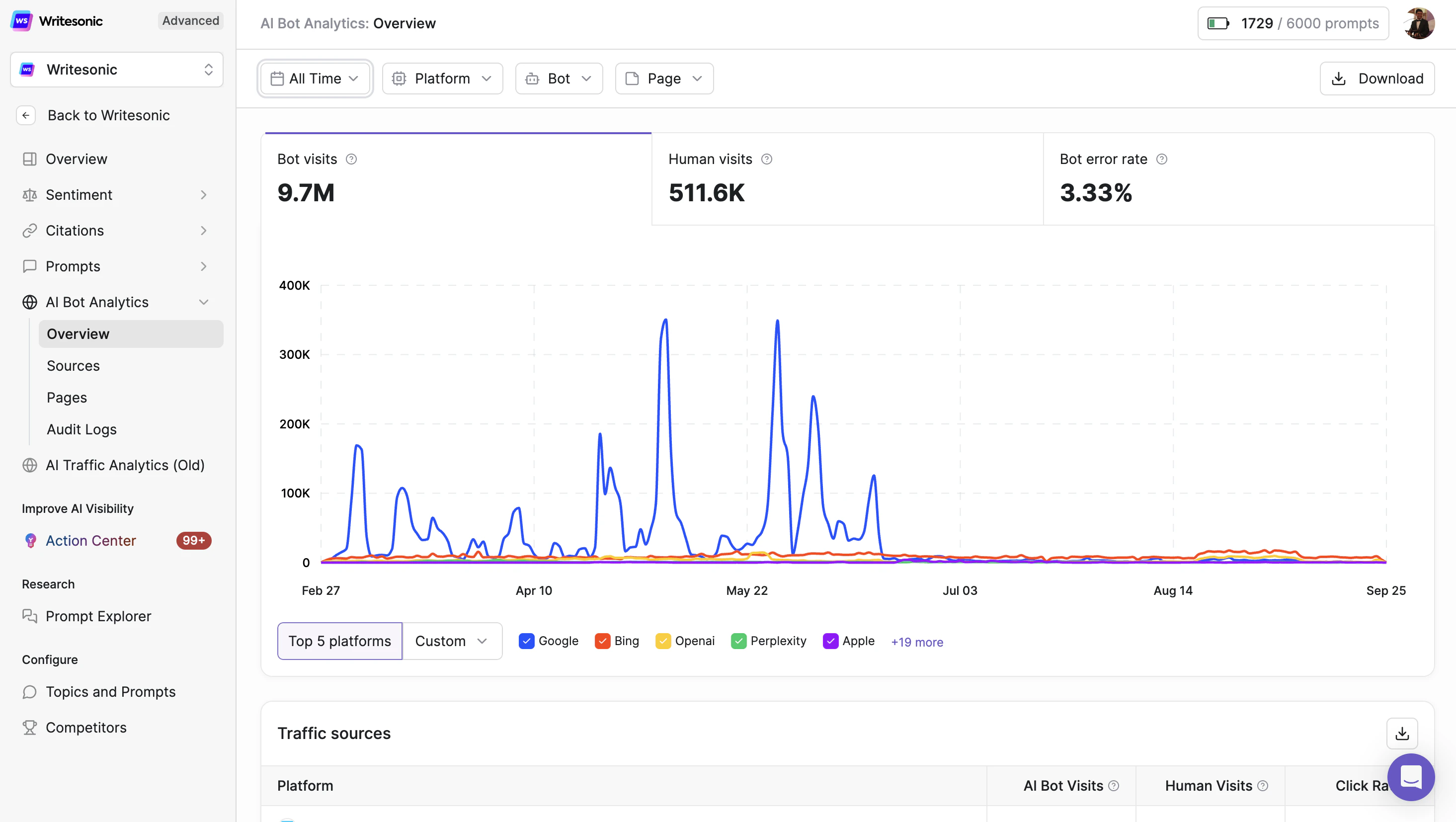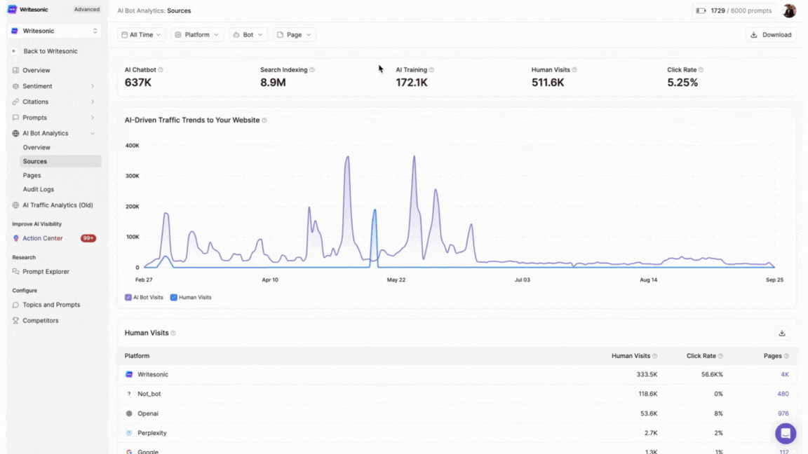 Interactive visualization showing bot visits and human visits over time. Use the platform filter to analyze specific AI sources (Google, Bing, OpenAI, Perplexity, Apple, etc.) or view aggregate data across all platforms.Traffic Sources Table
