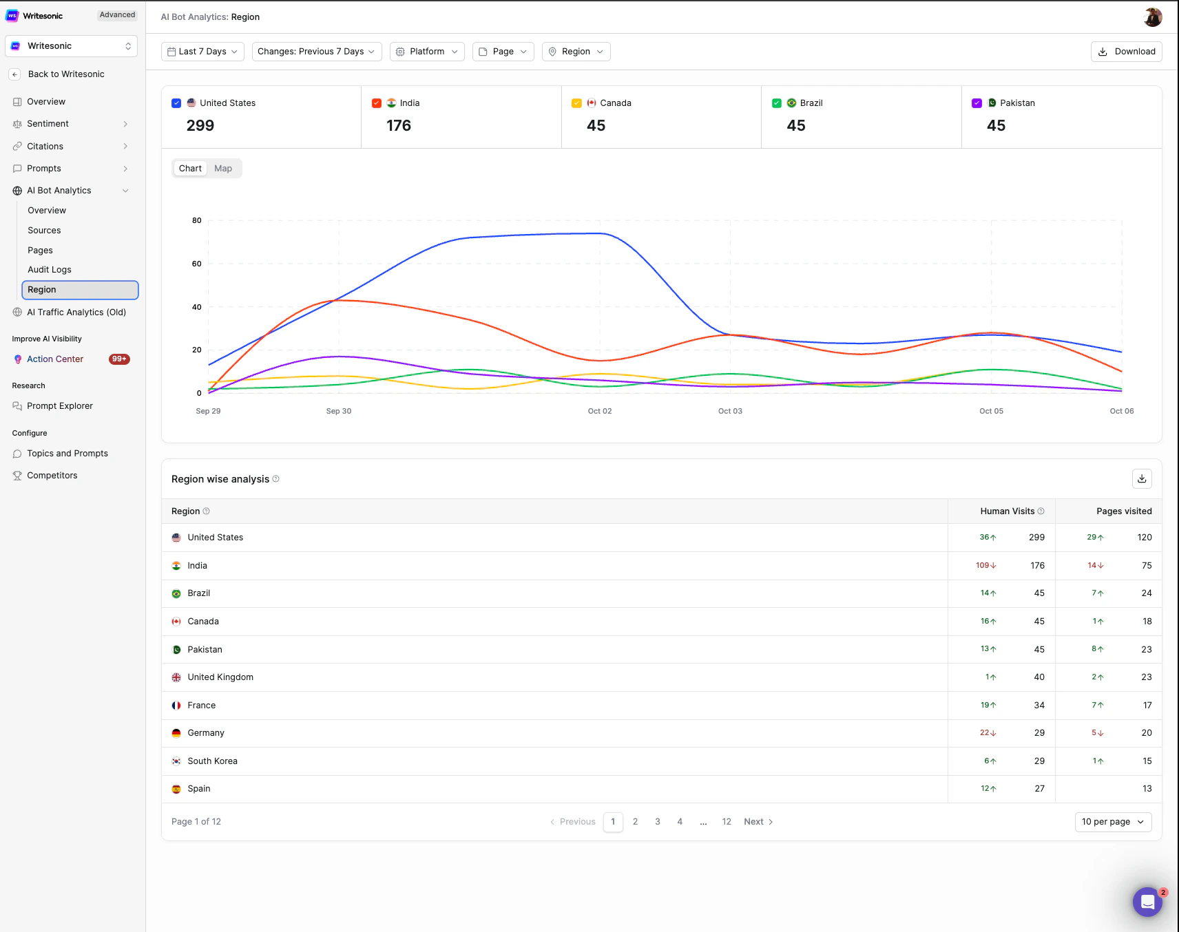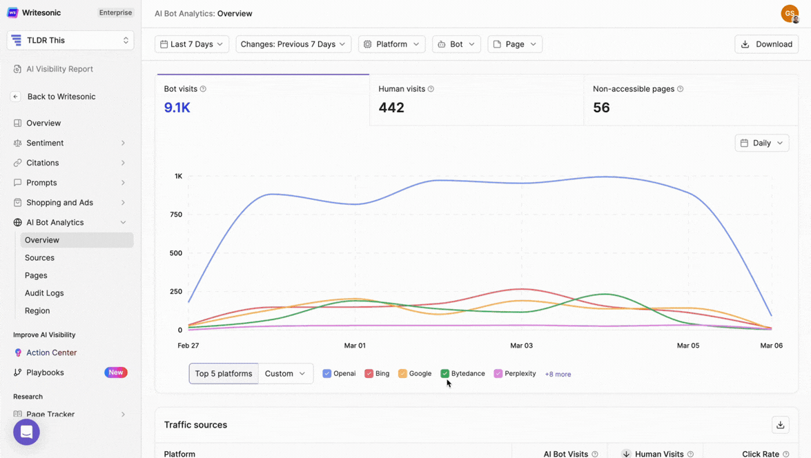- Platform Breakdown: Understand which AI systems engage most with your content