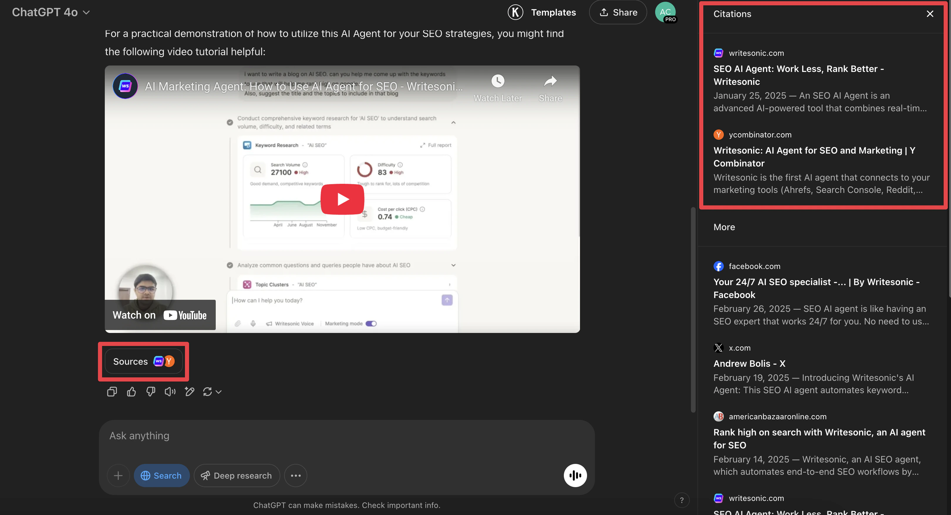 The Sources section provides detailed analysis of each AI platform’s interaction with your site.