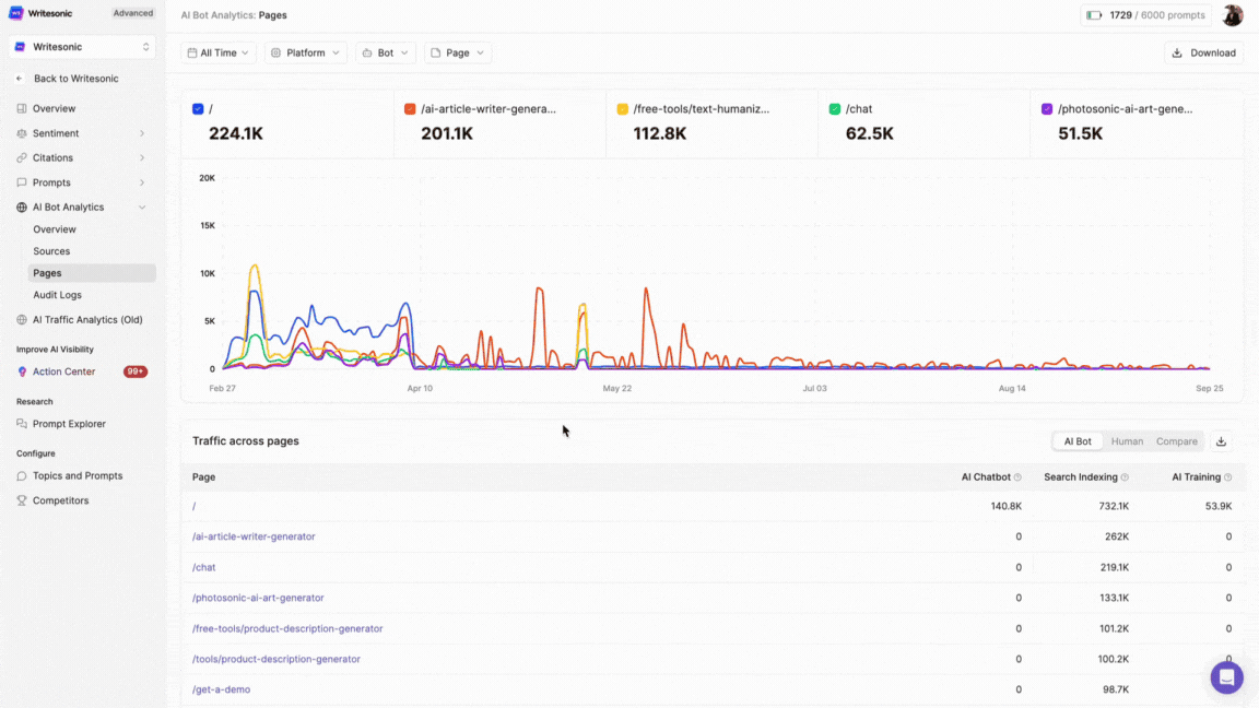 - Content Performance Analysis: See which pages AI systems visit most frequently