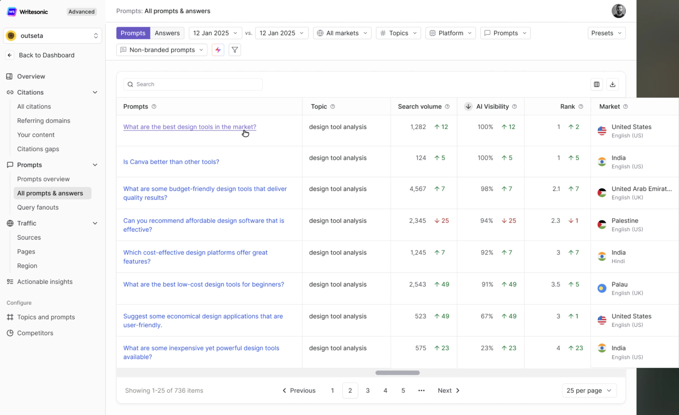 - Query Fanouts — Shows the related query categories or fanout types that this prompt/answer maps to (e.g., “Social media content creation,” “Online Graphic design”). Query fanouts reveal how AI platforms interpret and expand the original prompt.