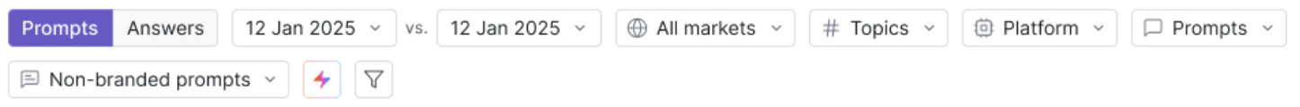 - Non-branded / Branded Prompts Toggle — Switch between viewing prompts that don’t contain your brand name (non-branded) and those that do (branded). This helps you separately analyze discovery-intent queries vs. brand-specific queries.