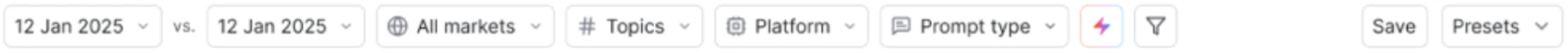 Note: The Citations Overview page supports two views — Branded prompts and Non-branded prompts — which you can toggle using the prompt type filter at the top. The branded view focuses on prompts that directly mention your brand, while the non-branded view shows prompts where AI could cite you based on topic relevance alone. Use the date range picker, market, topic, platform, and prompt type filters at the top of the page to narrow your analysis.
