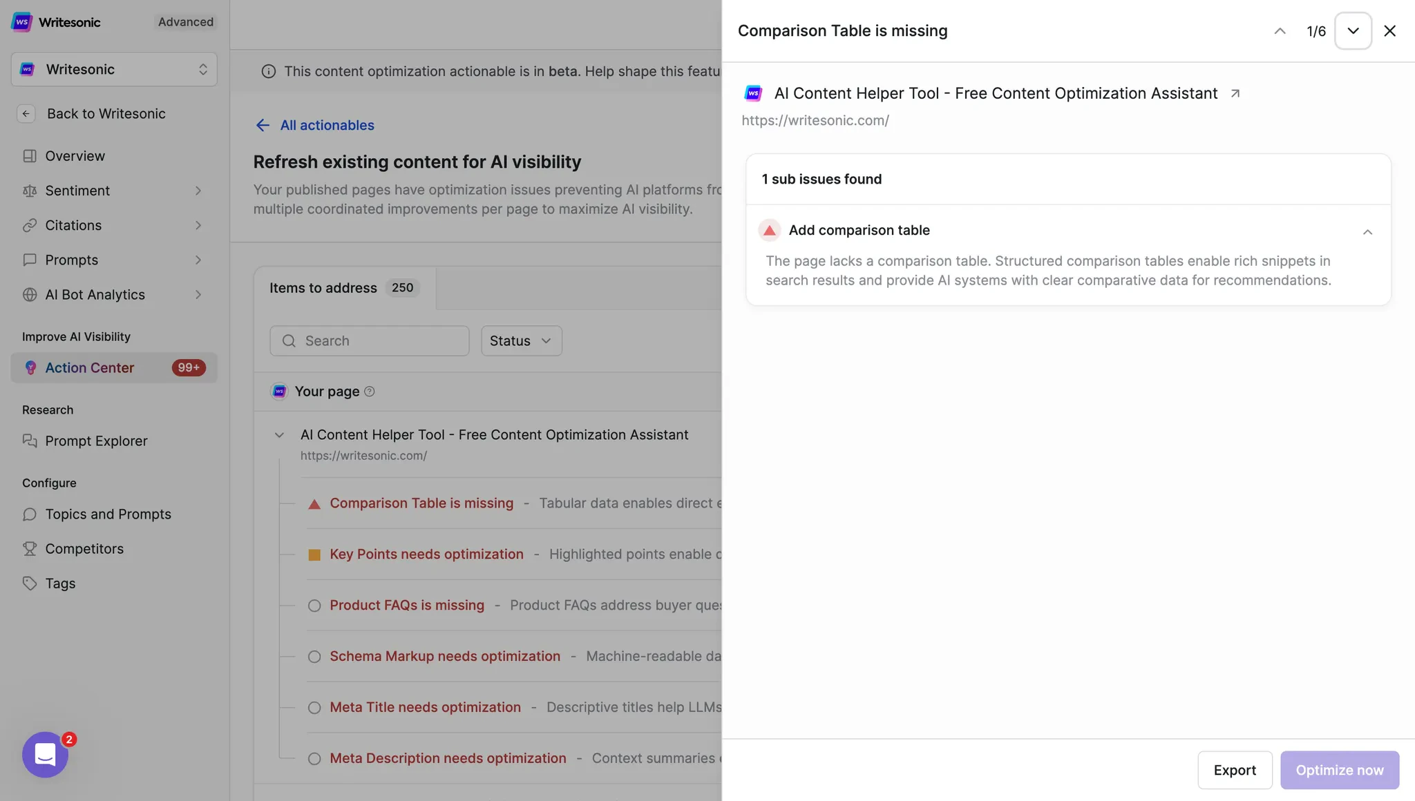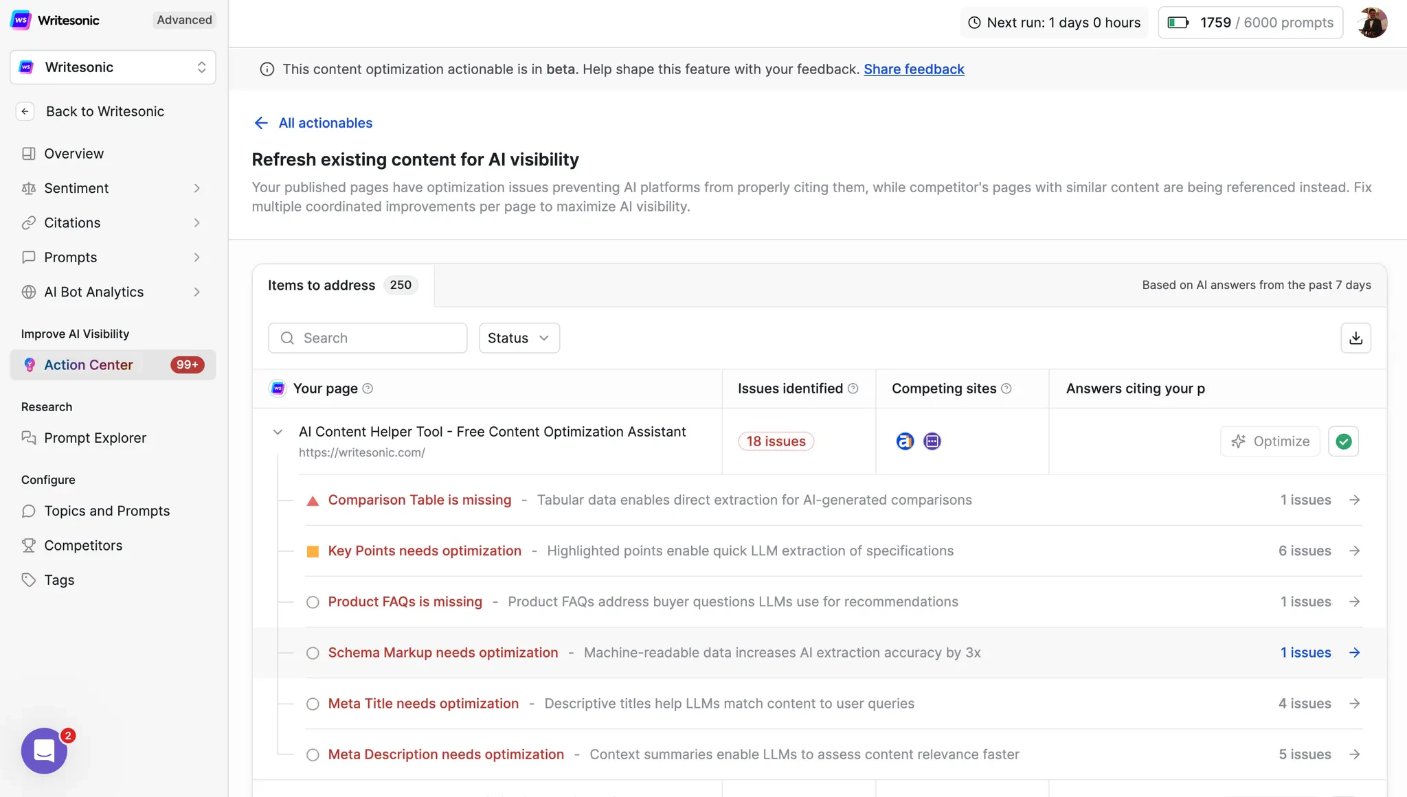 Ready to maximize your brand’s AI visibility? The Action Center’s Content Optimization feature provides a comprehensive roadmap to ensure your content ranks prominently in AI-generated responses. With clear issue identification, one-click optimization guidance, and competitive intelligence, you have everything needed to dominate AI search results in your industry. Access the Action Center in your Writesonic dashboard or contact your account manager to begin your GEO optimization journey today.Action Center: Actionables Prompt Explorer