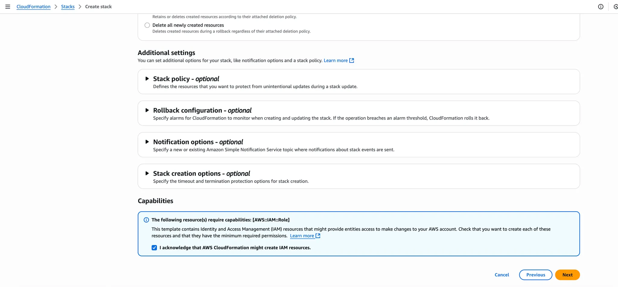 - Check the acknowledgment box confirming that CloudFormation might create IAM resources