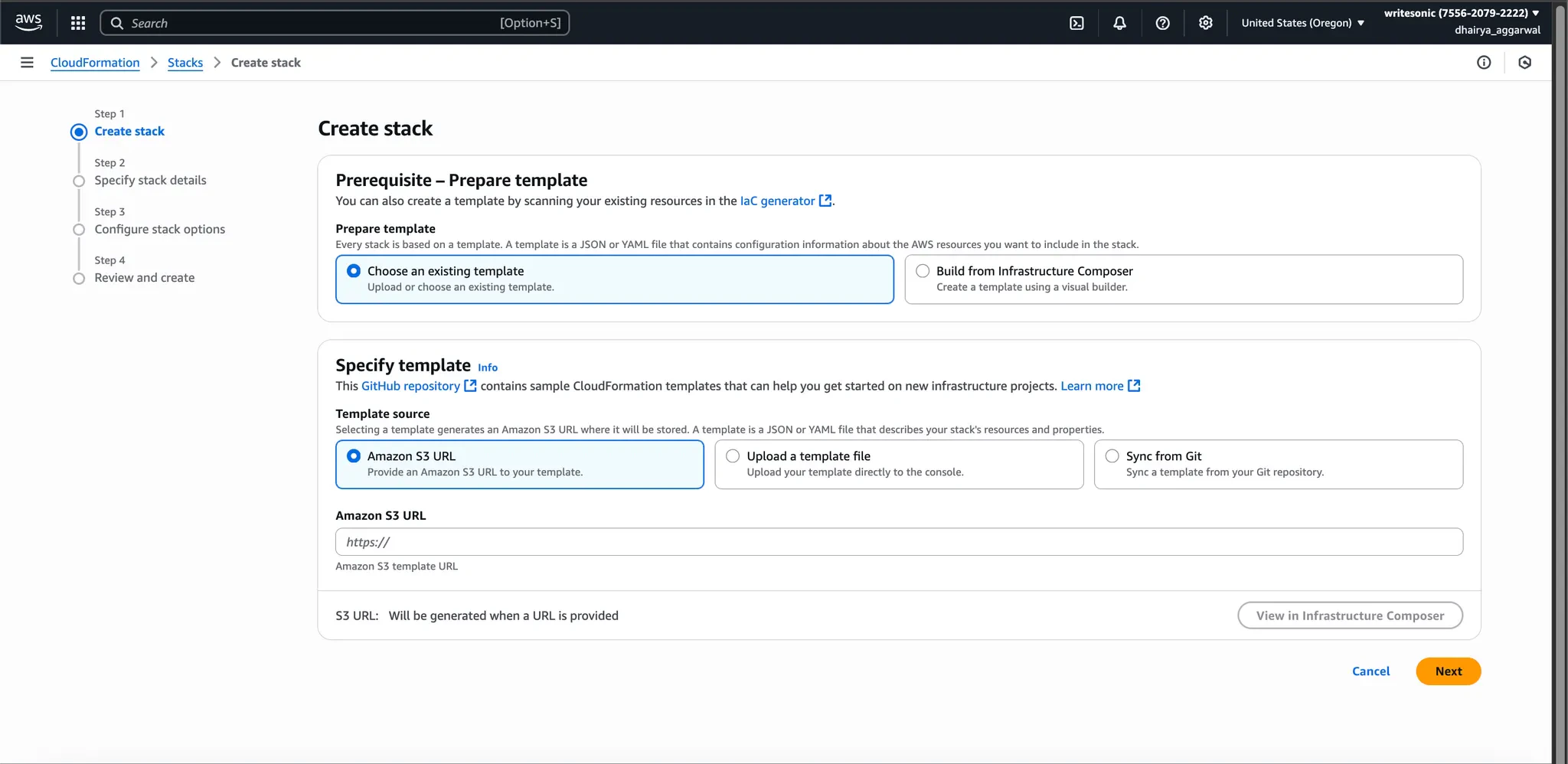 - Click “Choose file” and upload the CloudFormation template provided by Writesonic
