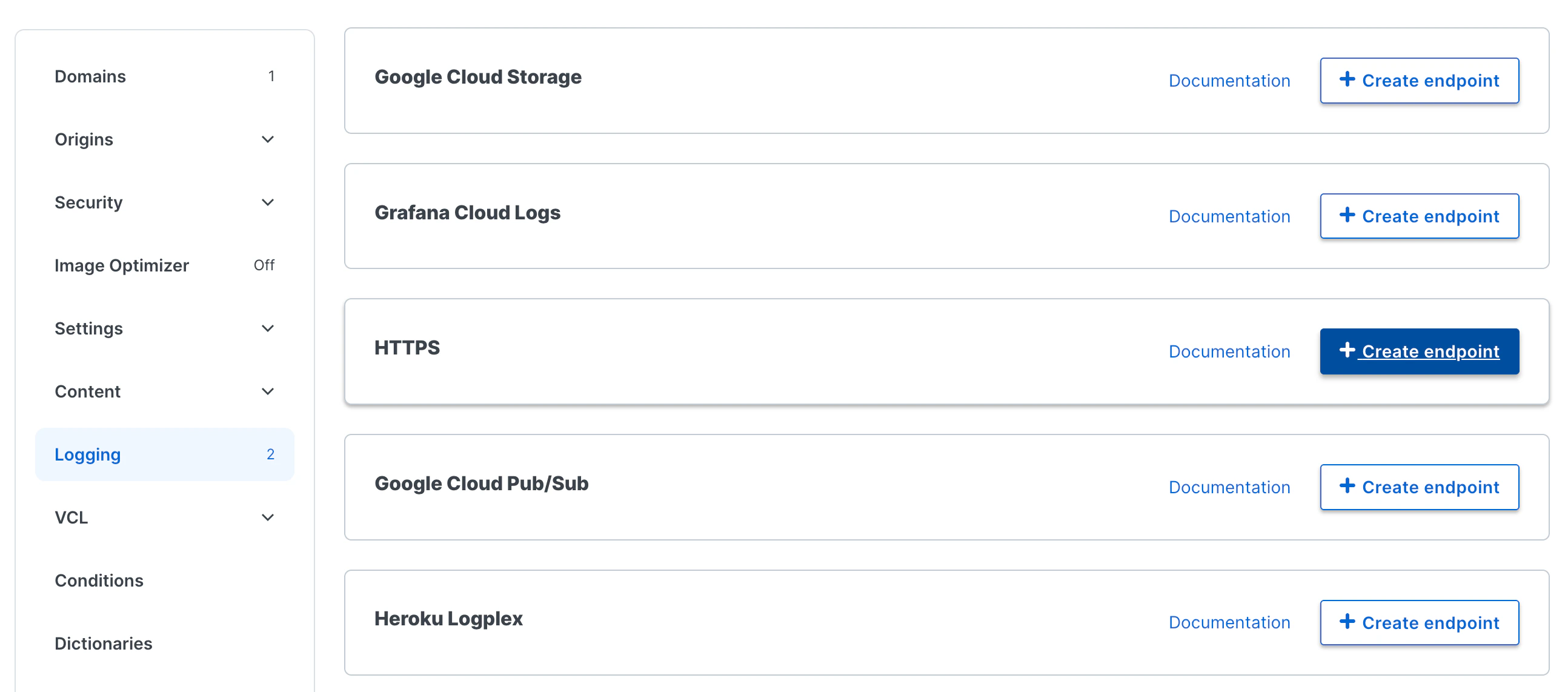 - In your Fastly CDN Service, navigate to: “Service Configuration” > “Logging” > “Create endpoint” > “HTTPS” > “Create endpoint”