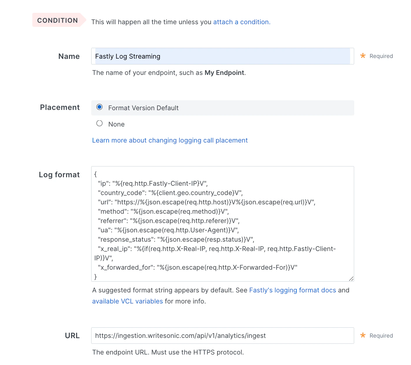 - Log Format: Copy the Log Format from Writesonic and paste it in the ‘Log Format’ field in Fastly