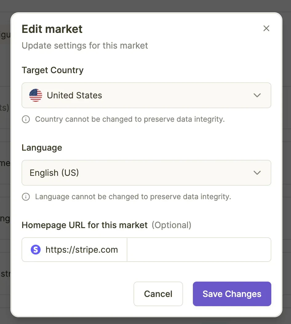 Access the edit function through the pencil icon in the Manage Markets interface. You can modify:- Homepage URL: Update or add market-specific website URLs