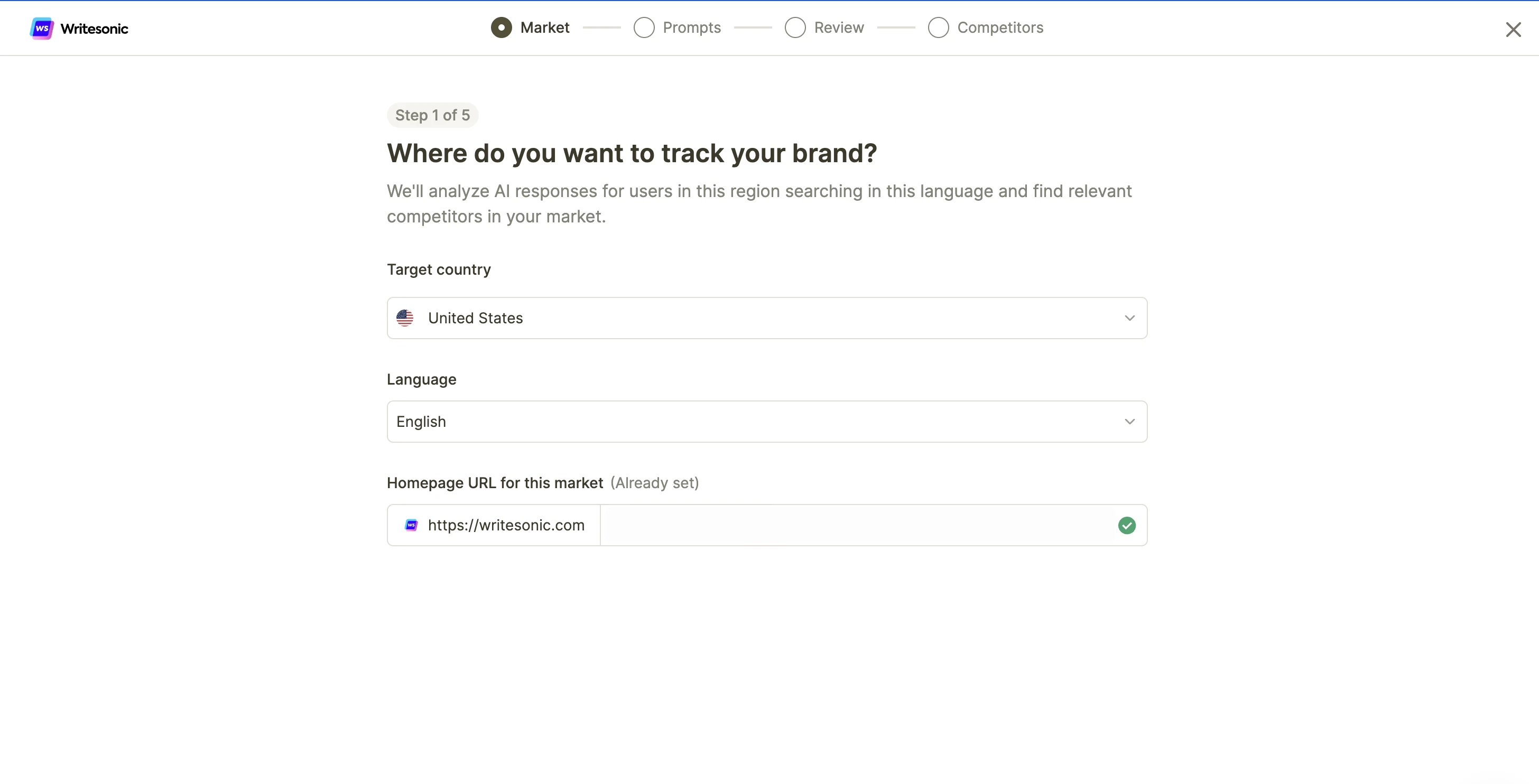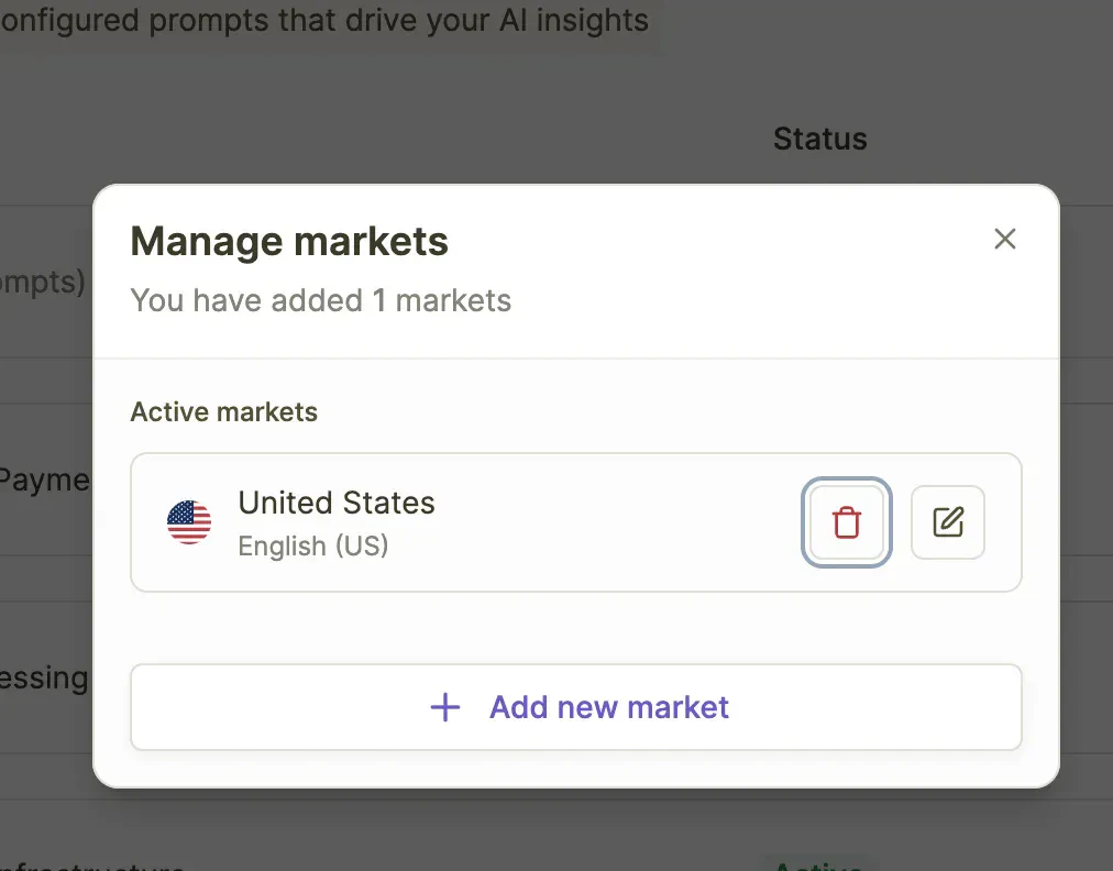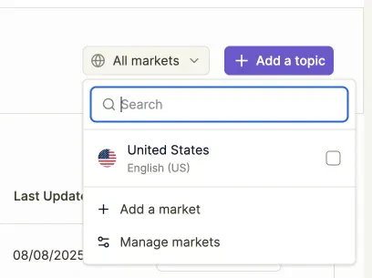 A: A Market is a specific combination of one country and one language that you want to monitor for AI visibility. For example, “United States - English” is one market, while “United States - Spanish” would be a separate market.Q: Can I track the same country with multiple languages?