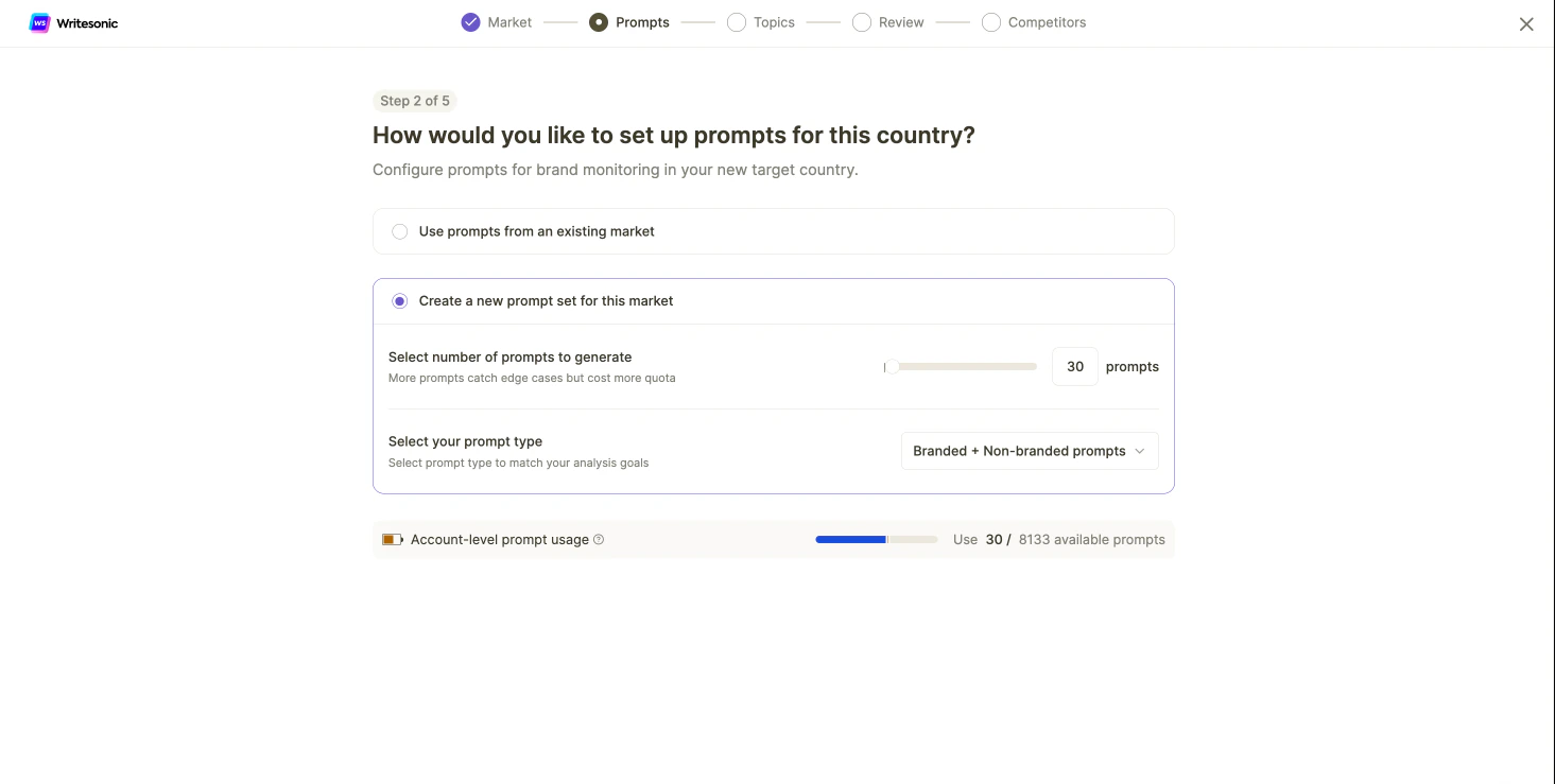 A: Prompts are counted independently for each market. If you use 30 prompts in Market A and the same 30 prompts in Market B, it counts as 60 prompts total against your quota.Q: Why can’t I change the country or language after creating a market?