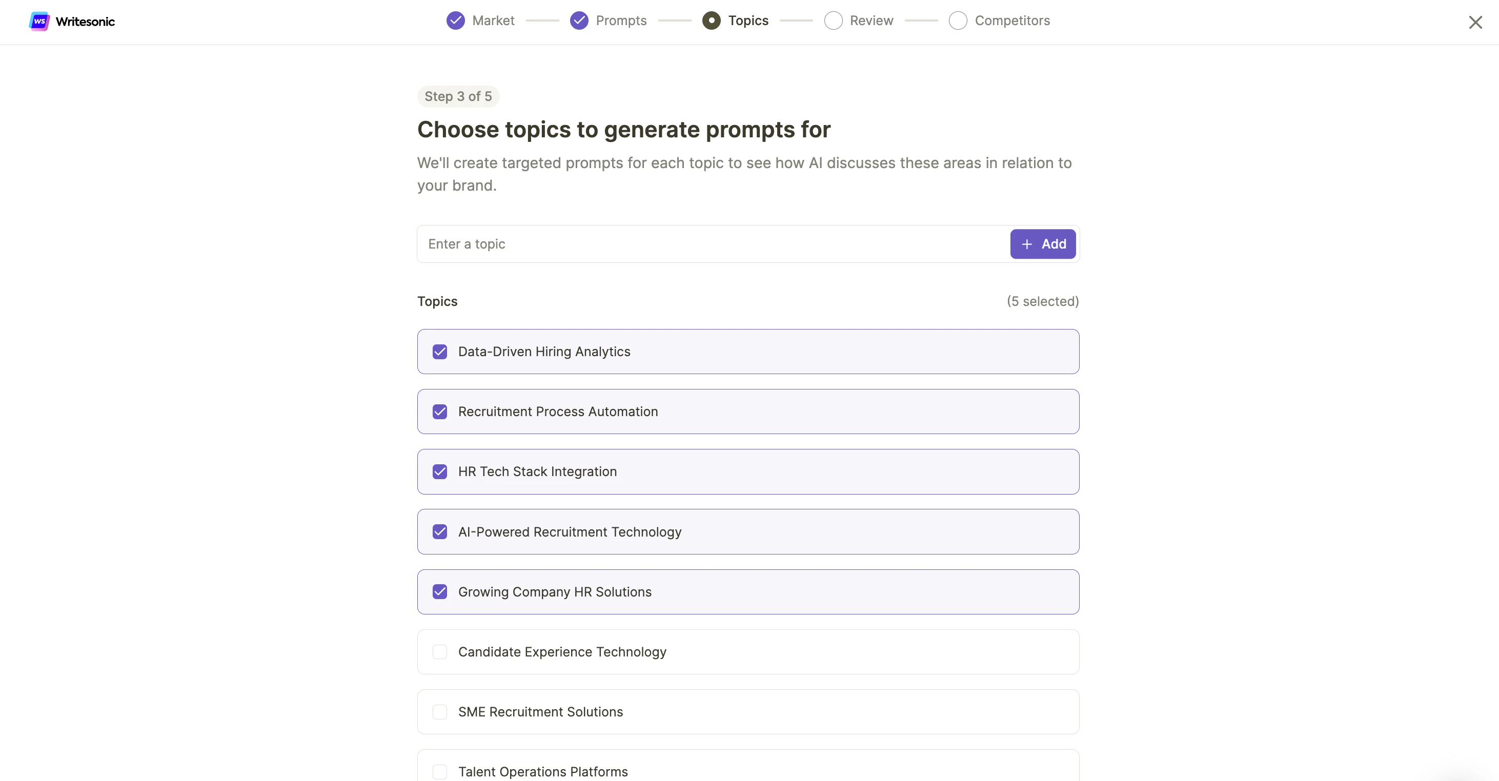- Select Topics Choose relevant topics for prompt generation such as: