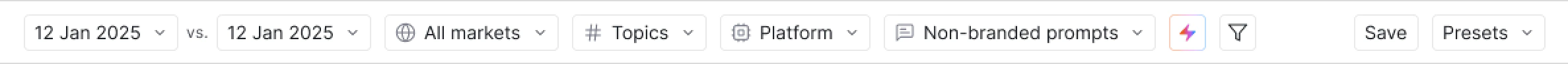 - Topics — Narrow the dashboard to one or more specific topics you’ve configured. Helps you evaluate AI visibility per product line, category, or business unit.