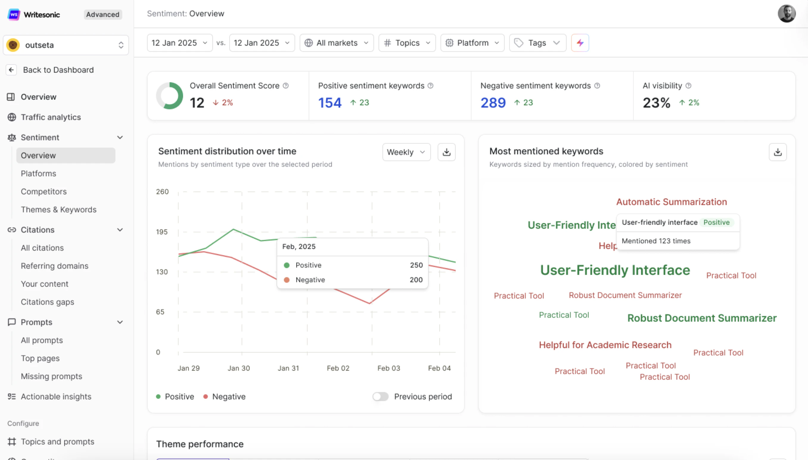- Act on Theme Performance. The theme table is your most actionable tool. Use it to brief content teams, inform product messaging, and identify specific areas for improvement.