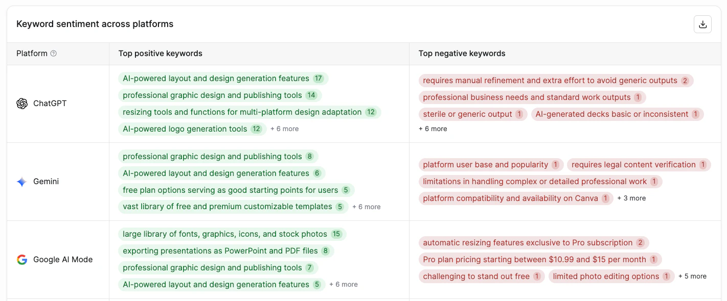 What this shows: A detailed table breaking down specific keywords and their sentiment performance on each platform. For every AI platform monitored, you can see: • Top positive keywords that generate favorable responses • Top negative keywords that trigger concerning content • Keyword counts and relevance indicators Each platform gets its own row with green-tagged positive keywords and red-tagged negative keywords, making platform-specific patterns immediately visible.