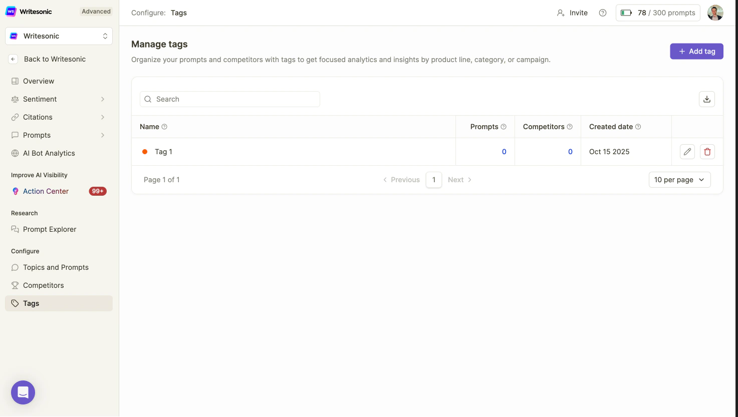 Tags are labels that help you categorize and track your AI search visibility by different dimensions like products, services, campaigns etc within Writesonic’s GEO platform. By tagging your prompts and competitors, you can gain focused AI Visibility insights into specific aspects of your organization. Whether you’re managing multiple product lines, tracking seasonal campaigns. Tags enable you to segment your GEO analytics for more tactical insights.